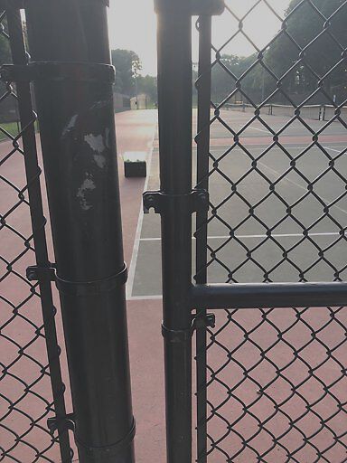 This door closest to the tennis building at Waldenstein Park on the tennis court is missing the latch that all the other doors have. Dogs now push the door open and go onto the tennis court.