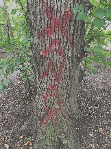 Tree and bench in the Amory Woods have been tagged with graffiti