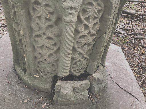 This sculpture is breaking and cracking and people are filling it with trash