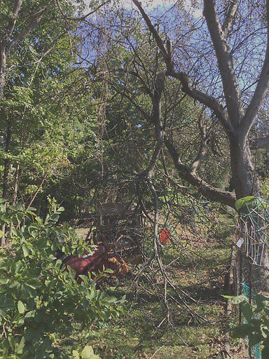 Major limb hanging from crab apple tree. This tree has at least one other large dead limb. Path is impassible.