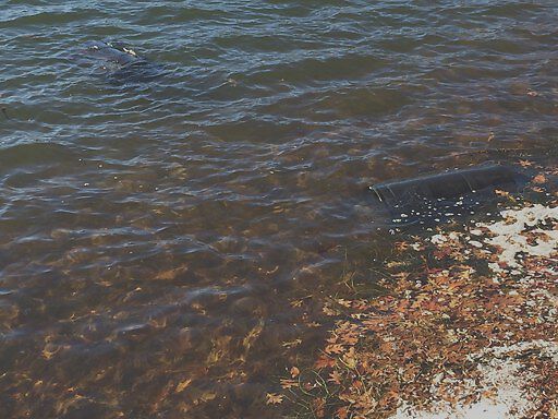 Two black barrels thrown into north east corner of Brookline reservoir near pump house.