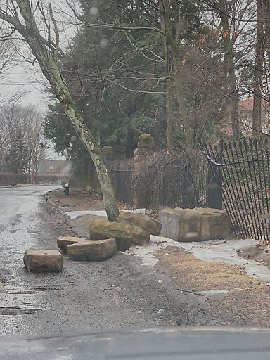 Large historic granite pillar has fallen onto Seaver Street, partially blocking the street.