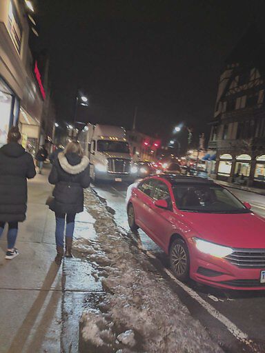 An 18 wheeler and a car blocking bike lane
