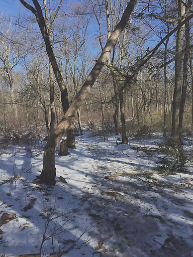 Broken trunk Tree balanced across path. Just past final board walk at lost pond