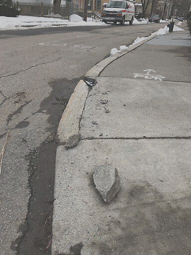 Curb damage by plow (again). The snowplow often takes this corner too closely, running over the sidewalk.