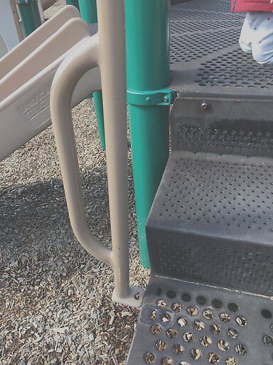 Guardrail on child playground equipment broken. Missing a bolt at the base.