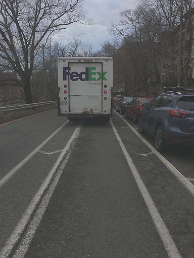 FedEx truck blocking the bike lane creating safety hazard for cyclists. There was room for the delivery man to park three space up, but driver was too lazy to walk 30 feet so was willing to make cyclists risk their safety merging into auto lane.