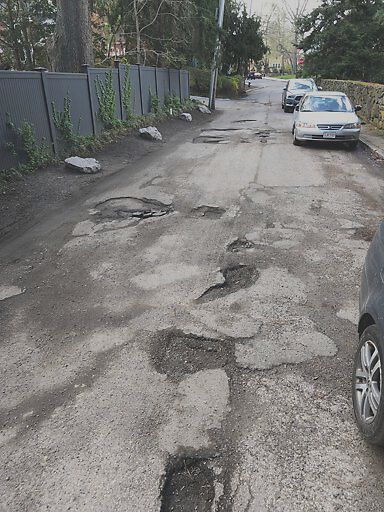 The entire street is riddled with potholes. This can cause property damage to vehicles.
