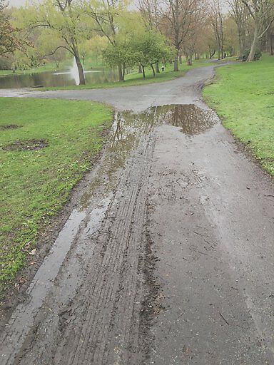 The entry to the Larz Anderson park from the Goddard ave gate always has a huge puddle that makes it impossible to pass even after light rain.