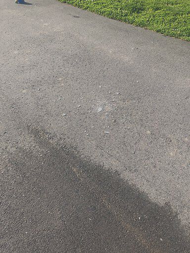 Broken glass bottle into small pieces, I picked up some of the larger ones but a big hazard for the park. Near the tables and tennis courts.
