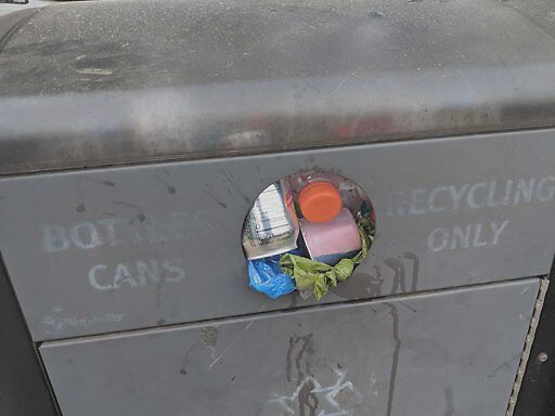 Trash can broken and overfull. Looks like it was not emptied since yesterday