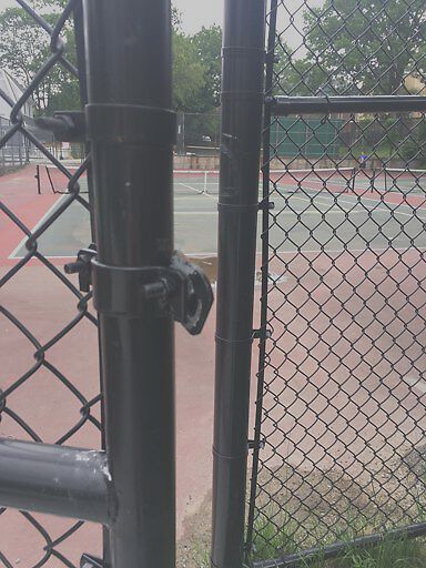 Latch in the gate to the Stedman St. tennis courts is broken. Also, the fencing in the gate is sagging, hitting the ground and preventing the gate from moving at all. So the gate is stuck open.