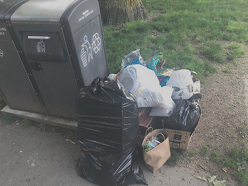 Hugh pile of trash at the park. Lots of food - for rats and bad for dogs.