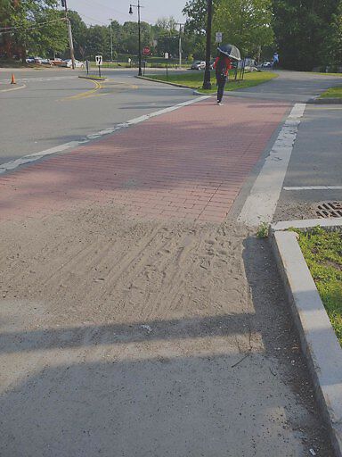 Need a new category for areas that need sweeping. Please remove gravel/sand debris from where sidewalk meets street. I'm concerned someone biking on Emerald Necklace path will be injured.