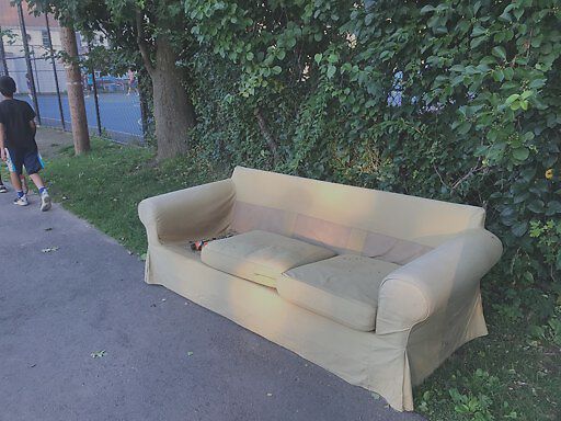 Abandoned sofa has been at Pierce Park for weeks. By baseball diamond.