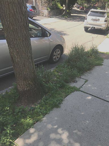 Sidewalk grass by tree very overgrown. Town needs to come cut it.
