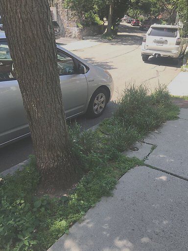 Sidewalk grass by tree very overgrown. Town needs to come cut it.