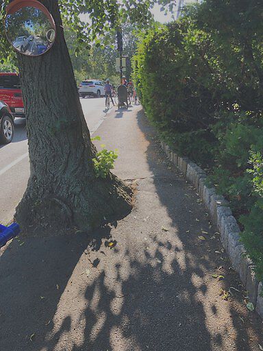 Tree has made sidewalk too narrow for wheelchair or stroller to pass through safely.